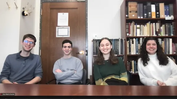 WashU Classics students Chris Robertson, Will Corbin, Heidi Tamm, and Ana María Nuñez on their Zoom with local seventh graders.